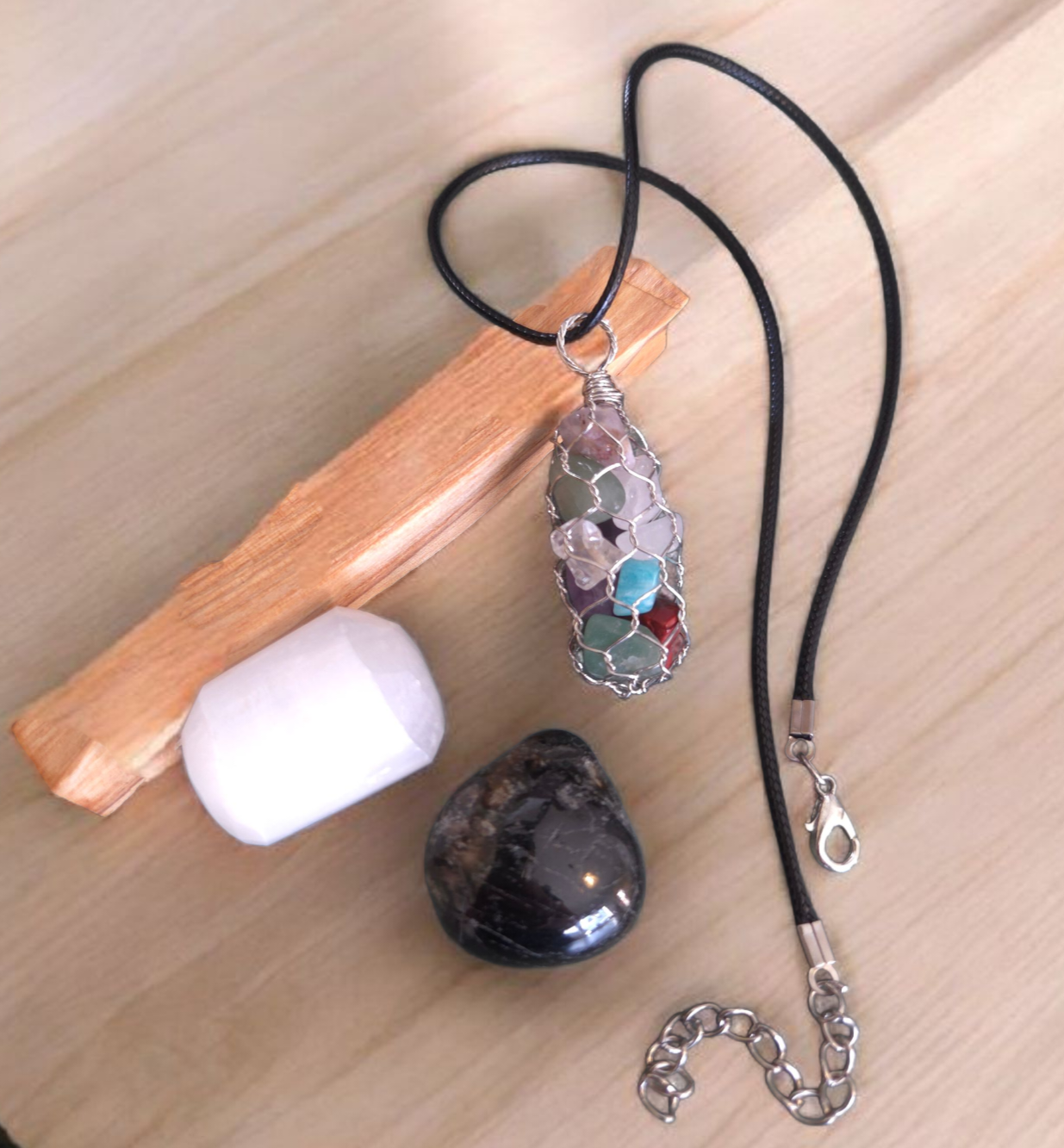 Chakra Chip Pendant – Including 1 x Selenite, 1 x Black Tourmaline, 1 x Necklace Cord & 1 x Palo Santo To Smoke Cleanse.